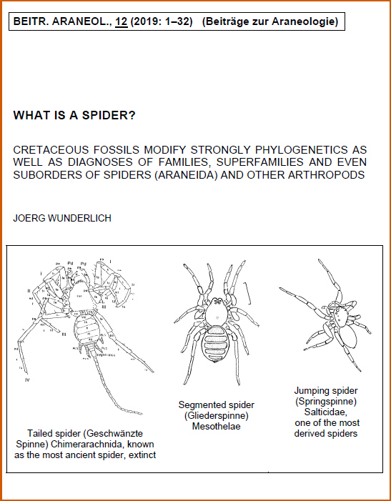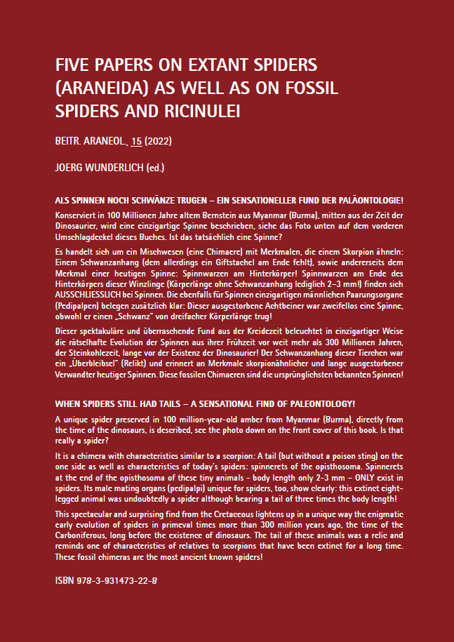 Besides a large popular "photo part" a scientific part is presented: Descriptions of about 400 new spider species, genera and families mainly in Baltic amber; revisions as well as identification keys; new findings e. g. on systematics, phylogenetics, palaeofaunas, palaeobiogeography, the palaeoclimate and palaeobiology (e. g. on fossil capture webs, spiders' prey, parasites, egg sacs, courtship and and moulting behaviour, camouflage/mimicry, autotomy) as well on fakes.